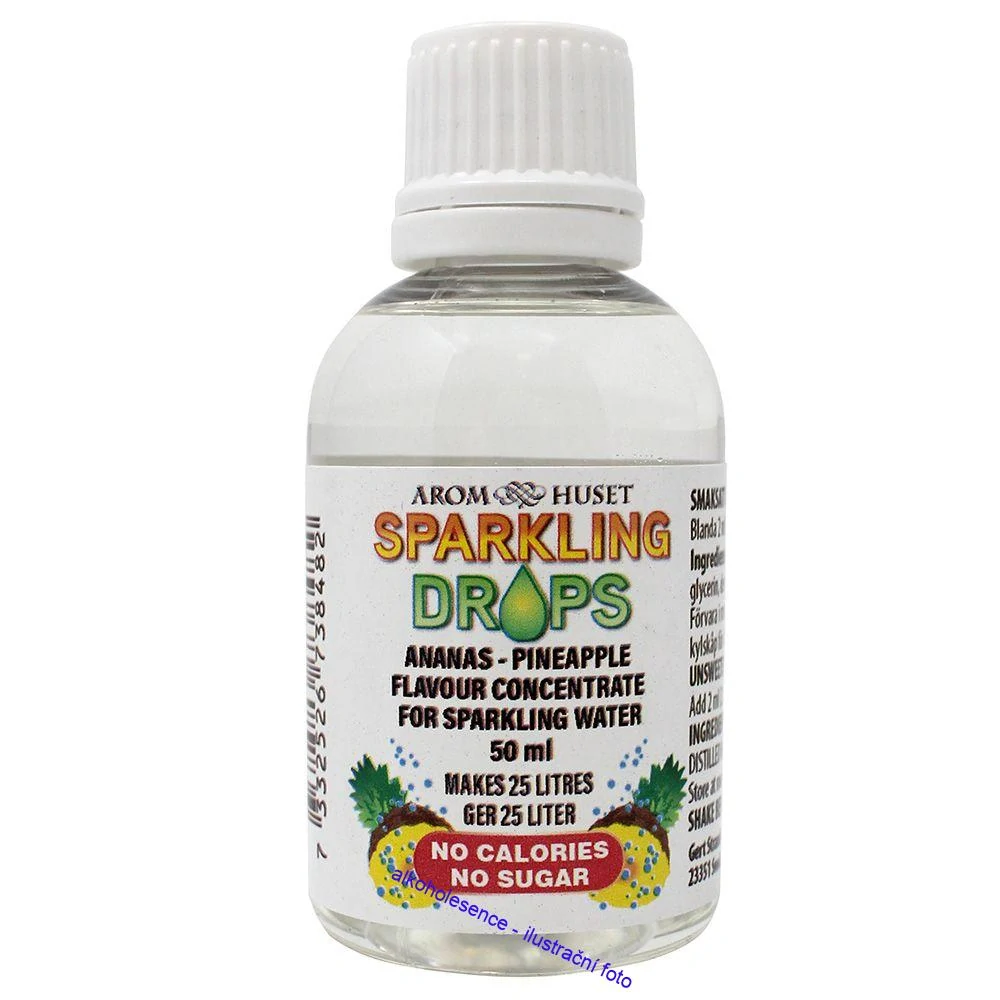 Příchuť Ananas bez kalorií a sacharidů pro ochucení perlivé vody. Nula kalorií. Vystačí na 25 litrů hotového nápoje. Funguje se všemi přístroji na výrobu sody, jako jsou Sodastream, Sodaclub, Aarke, Vikingsoda, AGA.