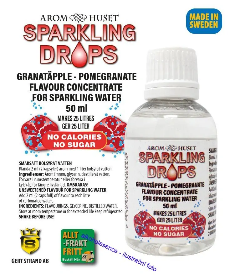 Příchuť Granátové jablko bez kalorií a sacharidů pro ochucení perlivé vody. Nula kalorií. Vystačí na 25 litrů hotového nápoje. Funguje se všemi přístroji na výrobu sody, jako jsou Sodastream, Sodaclub, Aarke, Vikingsoda, AGA.